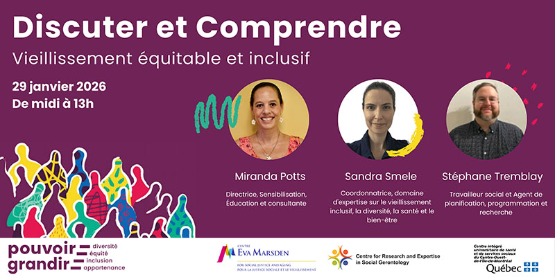 Dans le cadre d’un dialogue avec les panélistes, nous nous pencherons sur les occasions et les défis qui peuvent se présenter aux personnes âgées lorsqu’elles cherchent à vieillir avec dignité, en participant, en établissant des liens et en ayant un sentiment d’appartenance.
