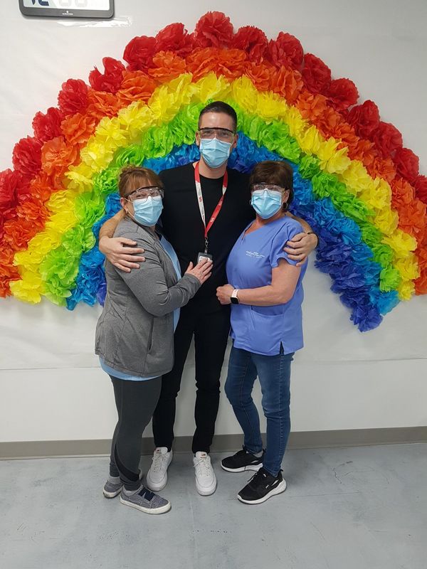 Thelma and Louise thought we needed some color in our super white clinic. Something for the clients to look at while they wait their 15 minutes after their vaccine. Collectively the pharmacy team made paper flowers in our spare time to form a rainbow. Many staff and clients took selfies after their vaccination. This picture was taken on one of our busiest day (1400+ clients). Our record day of pulling 84 vials in one batch.