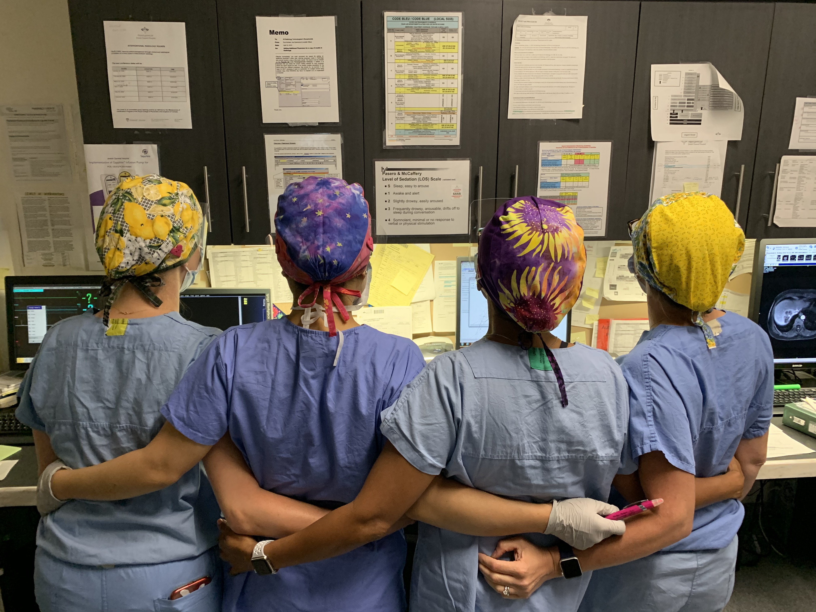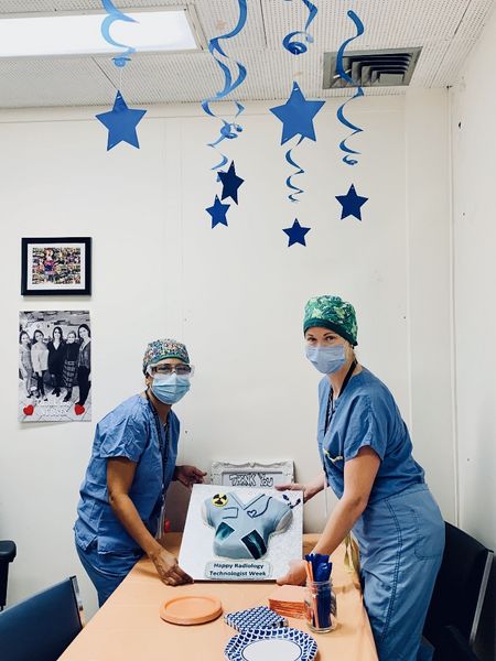 Interventional radiology girls intertwined to face difficult times. We are stronger when we join forces. I’m so proud to be part of this group if we when through this pandemic are because we support each other. Here we were so happy to receive beautiful hats courtesy of Becca Habberfield. After longer hours of work we still have fun together. It’s important to have a good relation with coworkers. I learned how to appreciate every one of my team. Take the time to laugh makes work easier. Here we were on call waiting for a COVID patient. Thank to one of our nurses Carla Peters in international radiology who made this cake for technologists week. Genius theme scrubs, pickling and x-ray films. Made us happy and smile ear to ear.